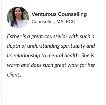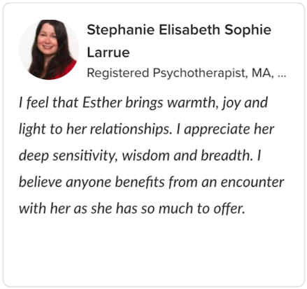 “Esther offers a safe presence and a heartfelt curiosity. It is rare that a counsellor is both brilliant and intuitive, but this is true of Esther. I would recommend her to a friend or family member without hesitation.”